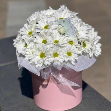 Хризантемы и Пионовидные кустовые розы в коробке + открытка ручной работы в подарок