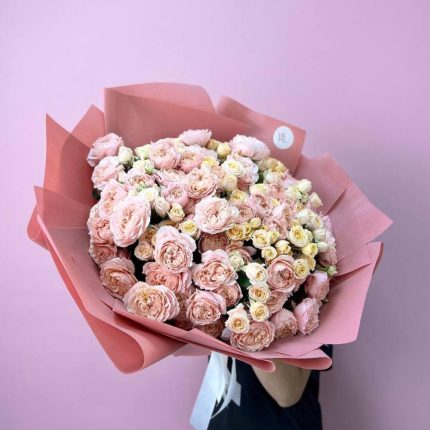 Бархатный цилиндр из голубых диантусов, розовых пионов и ароматной маттиолы