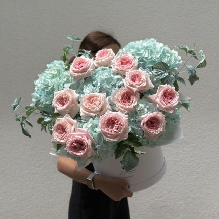 Букет с сиренью,пионовидными розами,матиолой,гвоздиками,одноголовыми розами и тюльпанами