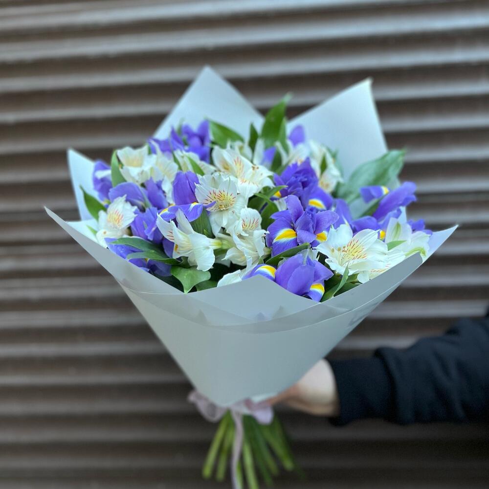 Альстромерия – 7 шт.Ирис – 12 шт.Корейская пленка – 2 шт.зелнень – 7 шт.