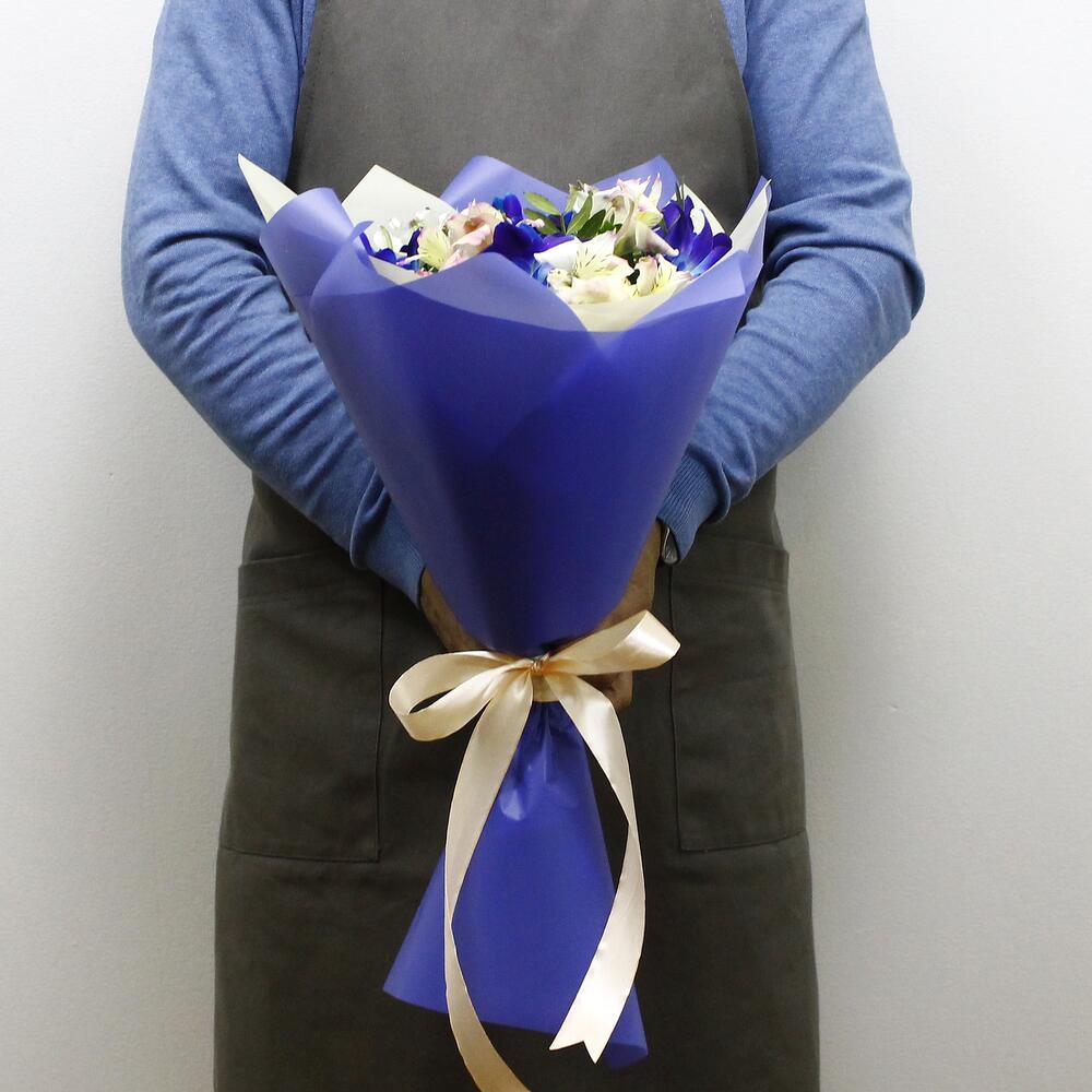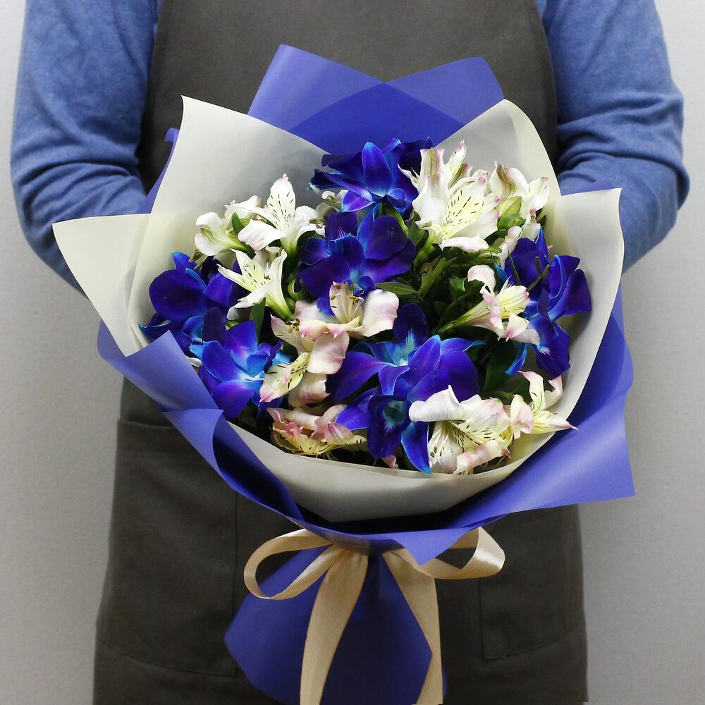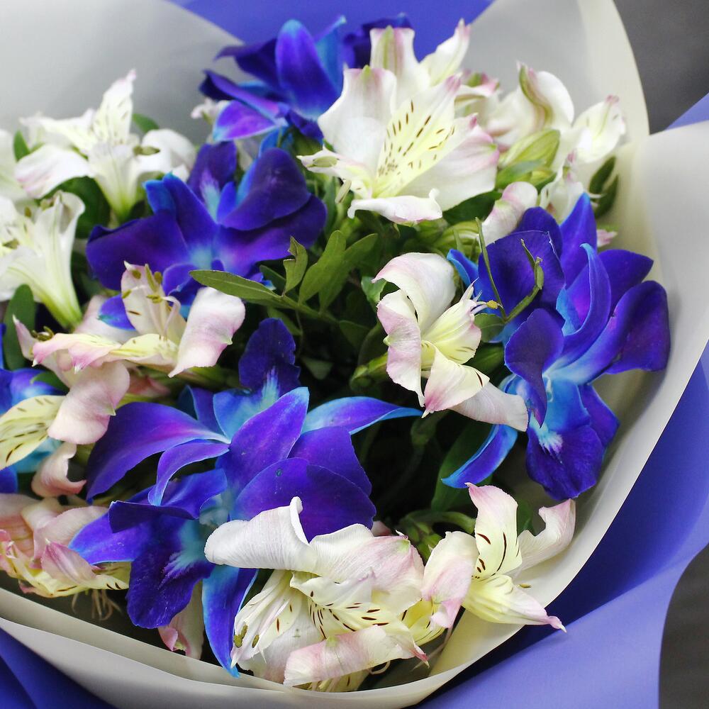 Альстромерия – 5 шт.Рускус – 6 шт.Лента атласная – 1 шт.удлинитель для орхидеи – 6 шт.Средство для продления жизни цветов – 1 шт.Дизайнерская упаковка – 2 шт.инструкция по уходу за цветами – 1 шт.любовь флориста (бесплатно) – 1 шт.орхидея дендробиум синяя цветочки – 12 шт.