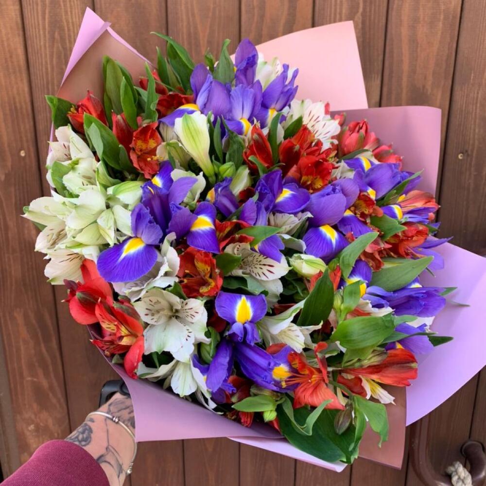 Альстромерия – 16 шт.Ирис – 9 шт.Упаковка дизайнерская – 2 шт.Лента атласная – 1 шт.