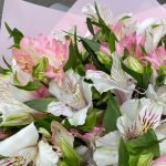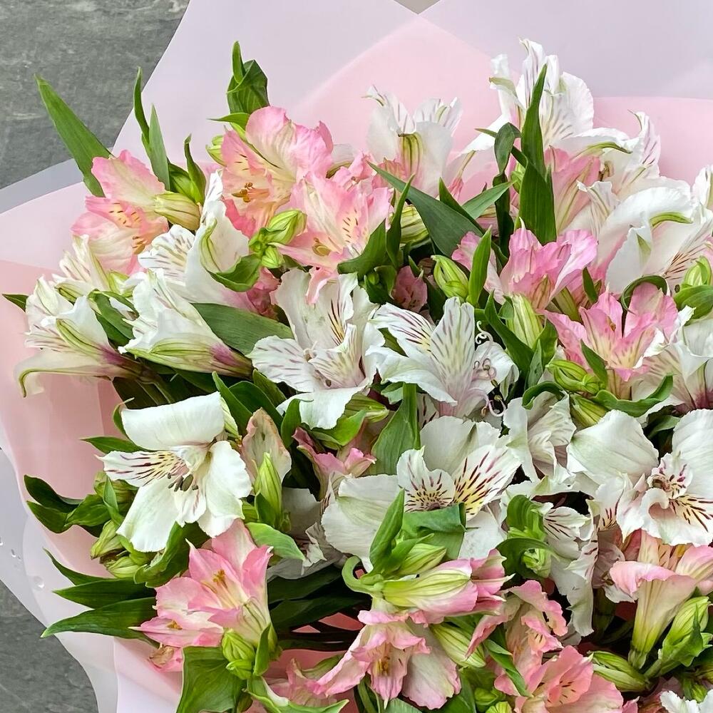 Лента атласная – 1 шт.Альстромерия белая – 7 шт.Альстромерия розовая – 8 шт.Дизайнерская упаковка – 3 шт.