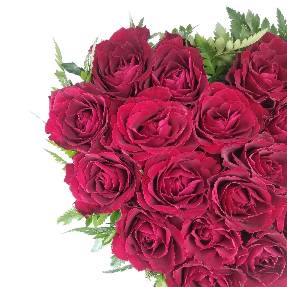 Composition in the form of heart from the single-headed red roses framed with fern. It is not necessary for the vase, because the roses are in floral oasis and get the necessary water out of it