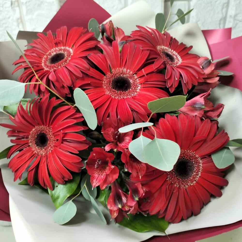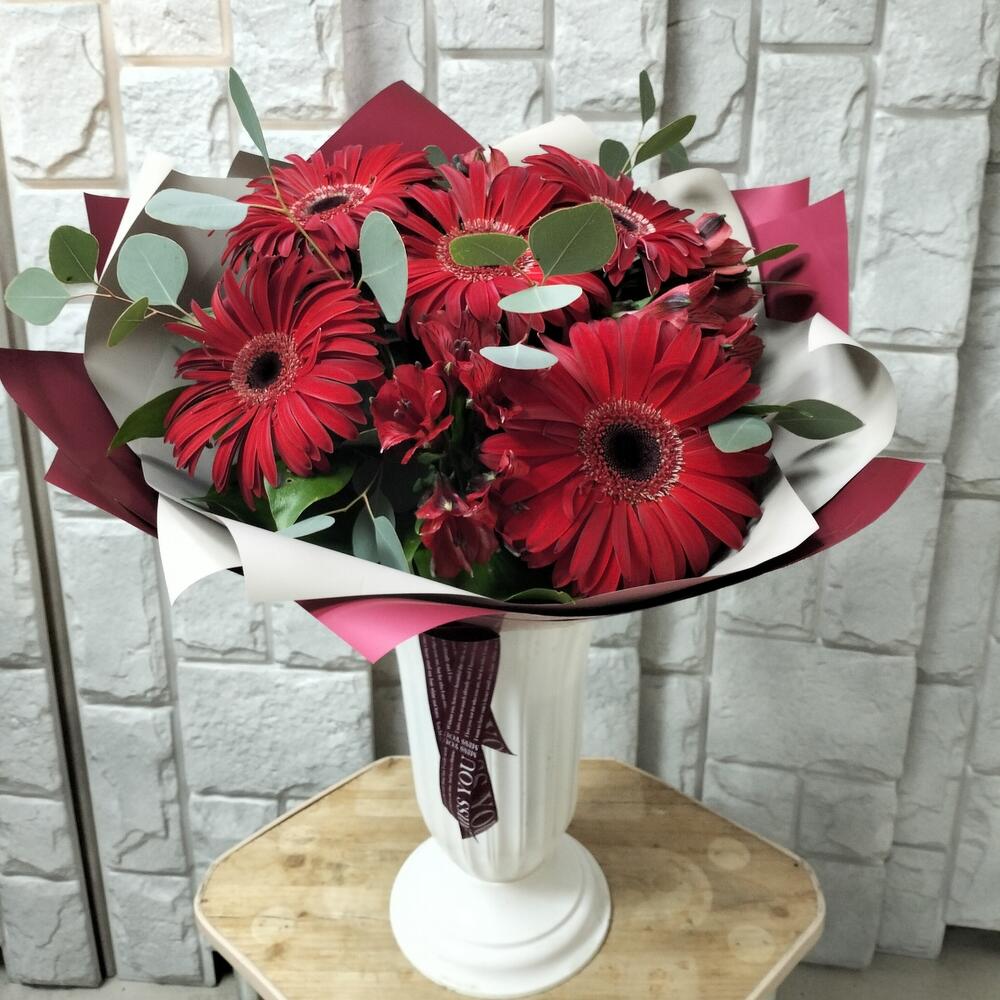 Эвкалипт Популус – 3 шт.Лента атласная – 1 шт.Гербера красная – 5 шт.Альстромерия Микс Европа – 3 шт.Упаковка калька флористическая – 2 шт.