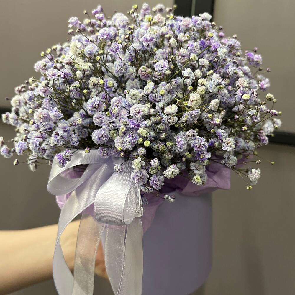 “Сиреневый туман” – композиция из гипсофилы в шляпной коробке