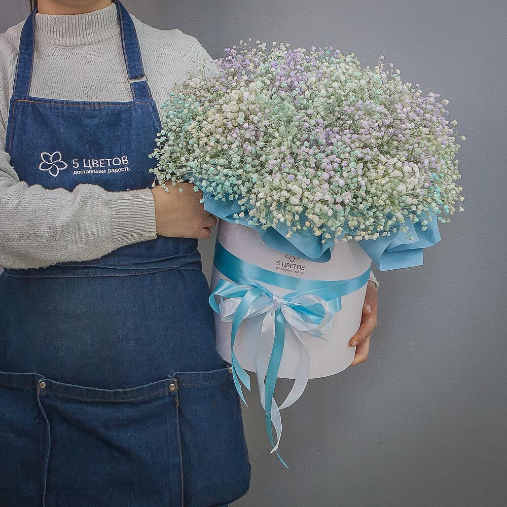 Букет цветов из 15 радужной гипсофилы в шляпной коробке