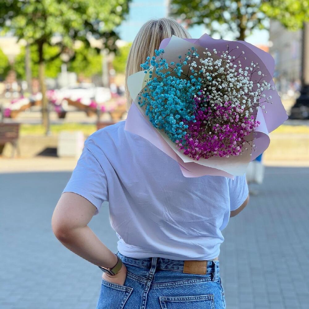 Гипсофила – 3 шт.Лента – 1 шт.бумага дизайнерская – 2 шт.