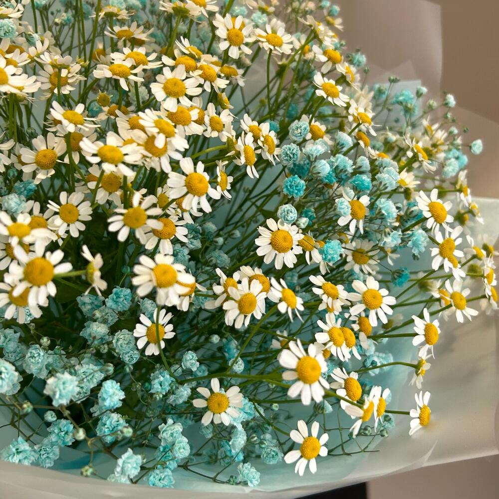 Гипсофила – 4 шт.Ромашка кустовая – 5 шт.Упаковка дизайнерская – 2 шт.