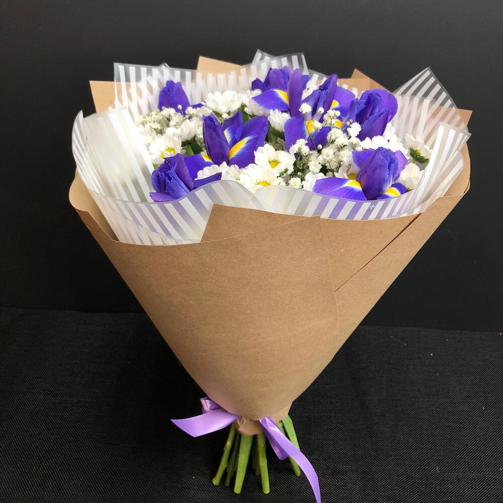 Сантини – 5 шт.Ирис – 7 шт.Гипсофила – 1 шт.Рускус – 5 шт.Крафт – 1 шт.