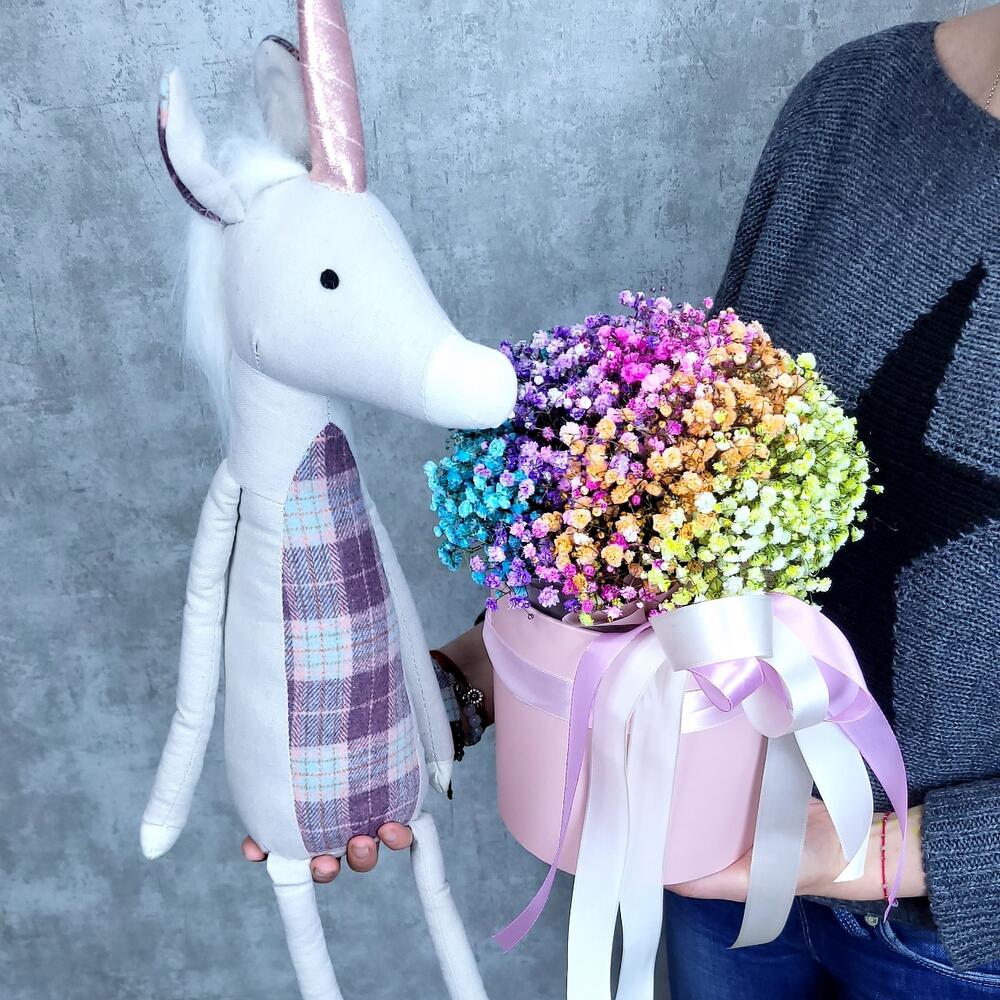 Единорог Евграф и коробочка с радужной гипсофилой