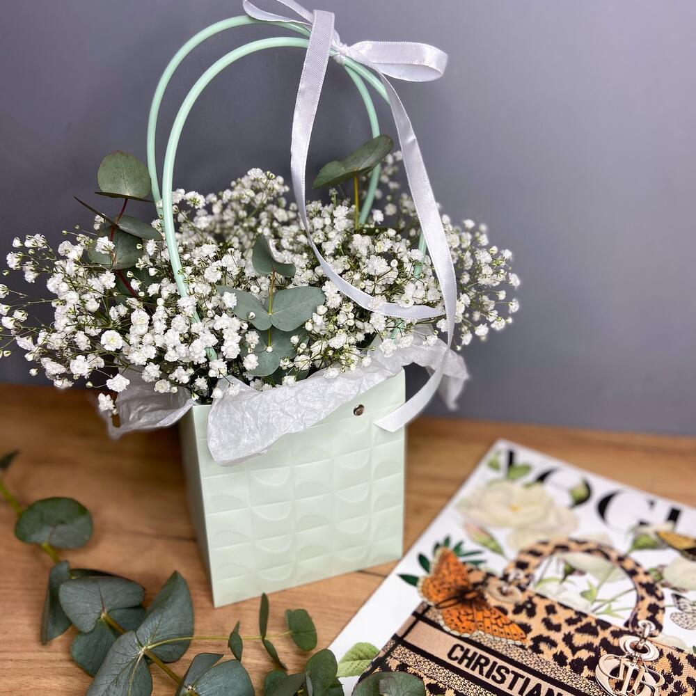гипсофила белая – 4 шт.Эвкалипт ценерея – 3 шт.сумка плайм с ручками – 1 шт.