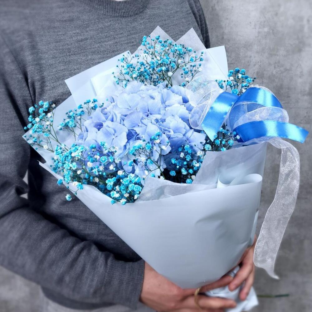 Гипсофила – 2 шт.Гортензия – 1 шт.Лента атласная – 1 шт.Упаковка дизайнерская – 1 шт.
