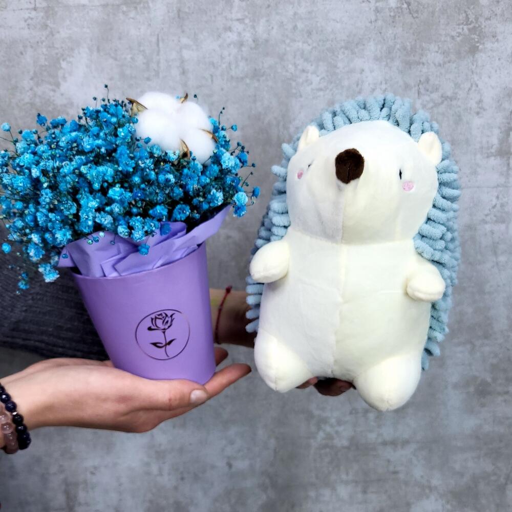 Голубой мини ёжик со стаканчиком гипсофилы