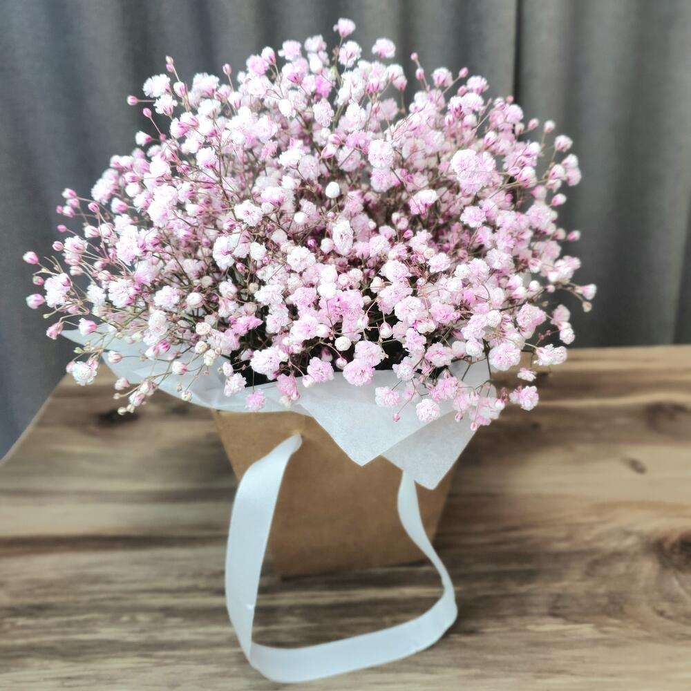 “Сиреневый туман” – композиция из гипсофилы в шляпной коробке