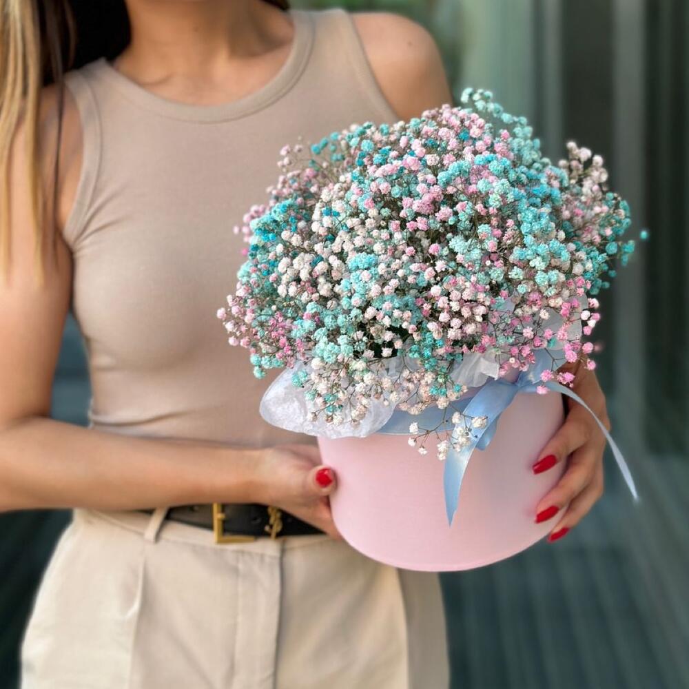 “Сиреневый туман” – композиция из гипсофилы в шляпной коробке