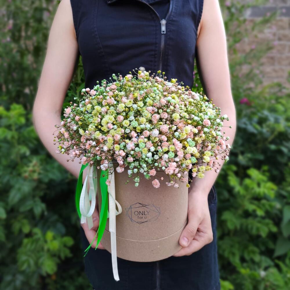 гипсофила микс – 8 шт.Шляпная коробка – 1 шт.Оазис флористический – 1 шт.