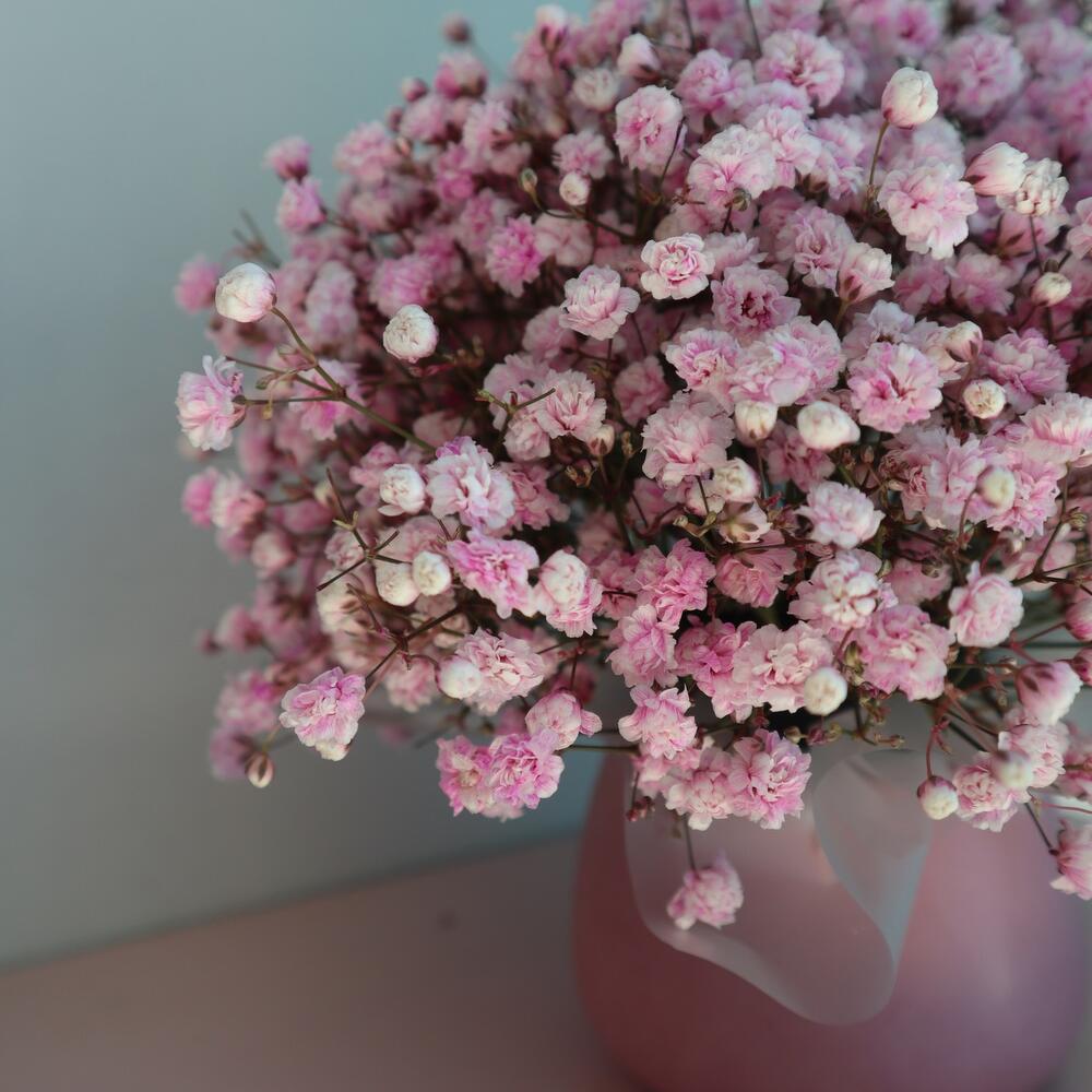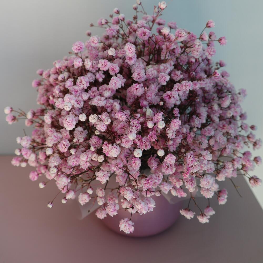 Гипсофила розовая – 4 шт.кашпо керамика ручной работы – 1 шт.Флористическая губка (оазис) – 1 шт.Матовая пленка – 1 шт.