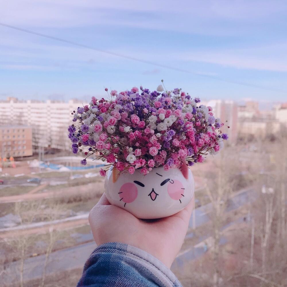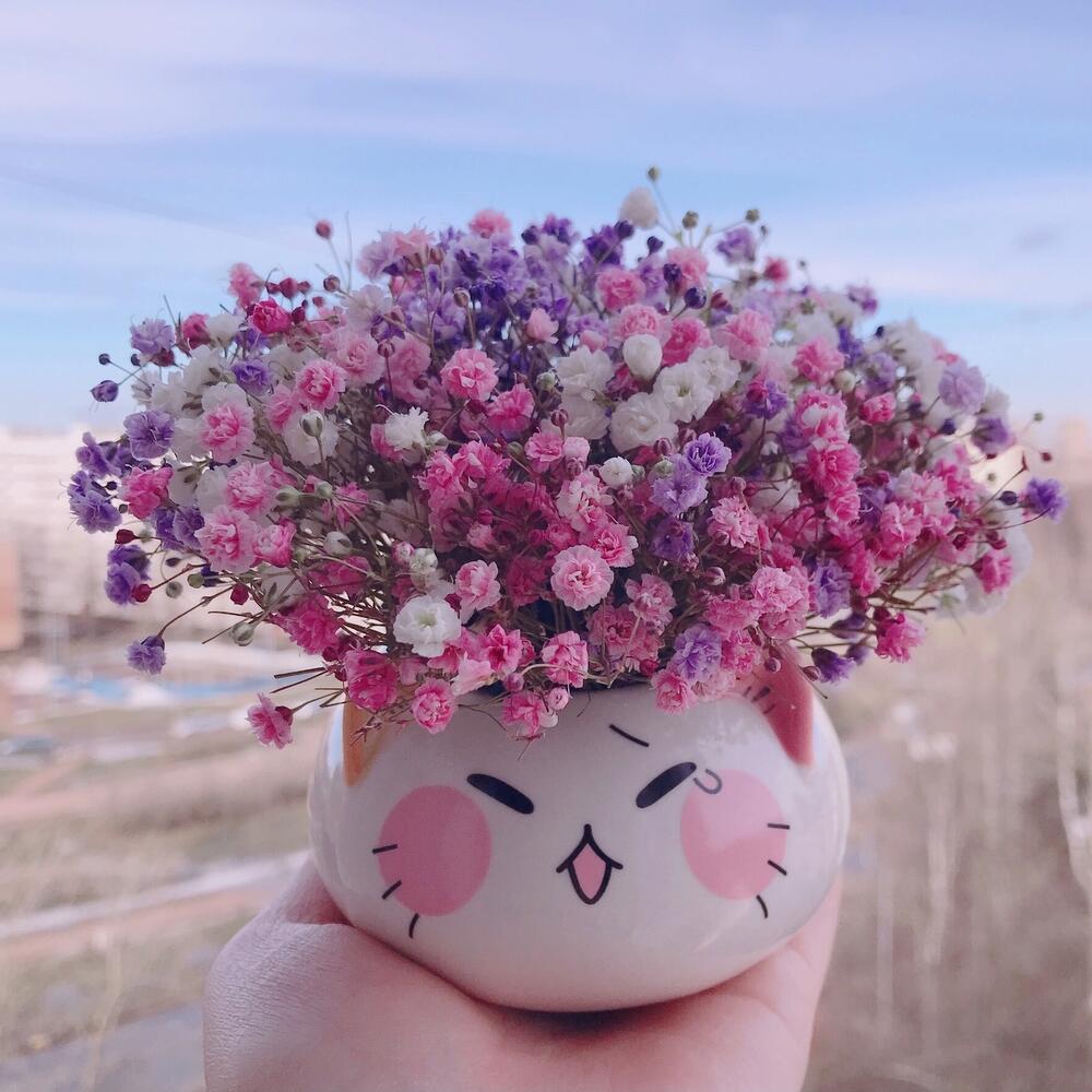 Керамическое кашпо – 1 шт.Флористическая губка – 1 шт.инструкция по уходу за цветами – 1 шт.гипсофила радужная – 3 шт.