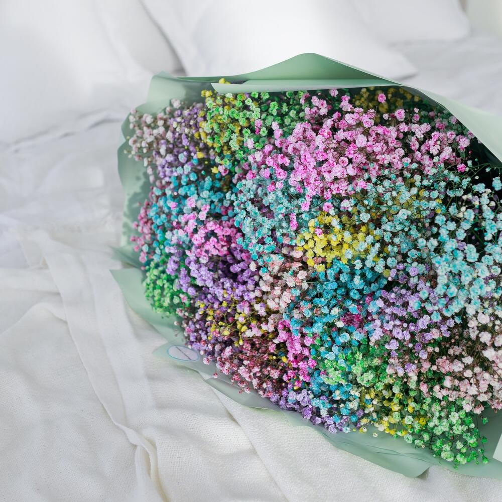 Радужный букет с гипсофилой
