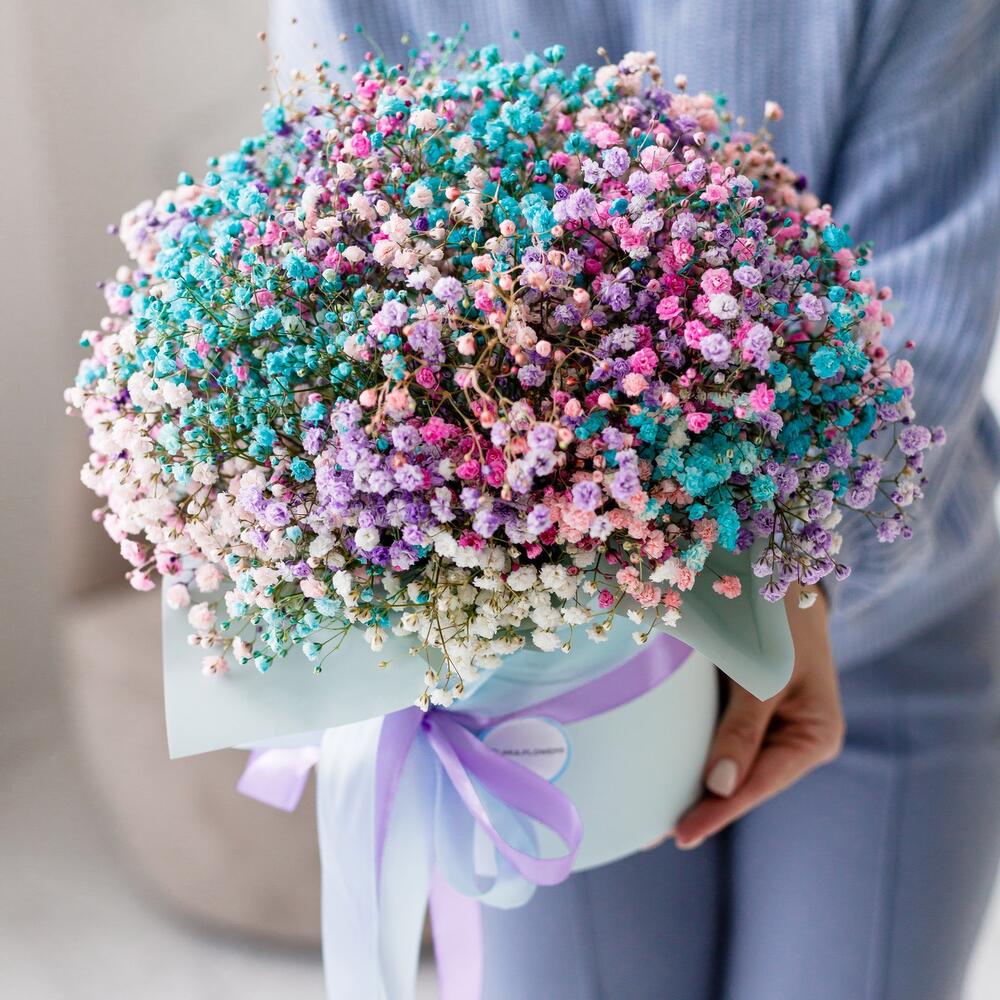 Очаровательная, воздушная композиция из гипсофилы, в шляпной коробке.Цветы стоят в специальной флористической губке,что позволяет им больше оставаться свежими и радовать получателя. Так же композиция в коробке это очень удобно и эффектно, так как не надо ставить букет в вазу и менять воду. Необходимо лишь подливать в губку воду.Инструкция по уходу за цветами прикреплена к каждому заказу.Цветы гипсофилы отличаются стойкостью и даже при высыхании не теряют, декоративности и цвета. Что позволяет, долгое время украшать интерьер в качестве сухоцветов.Подпишем открытку с вашими пожеланиями бесплатно