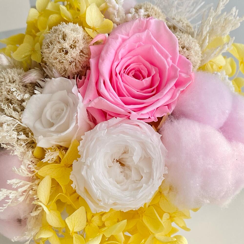 Гортензия – 3 шт.Хлопок – 3 шт.лимониум стабилизированный – 8 шт.розы стабилизированные – 3 шт.