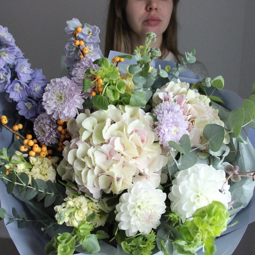 Нежный октябрь – Букет с гортензиями и дельфиниумом