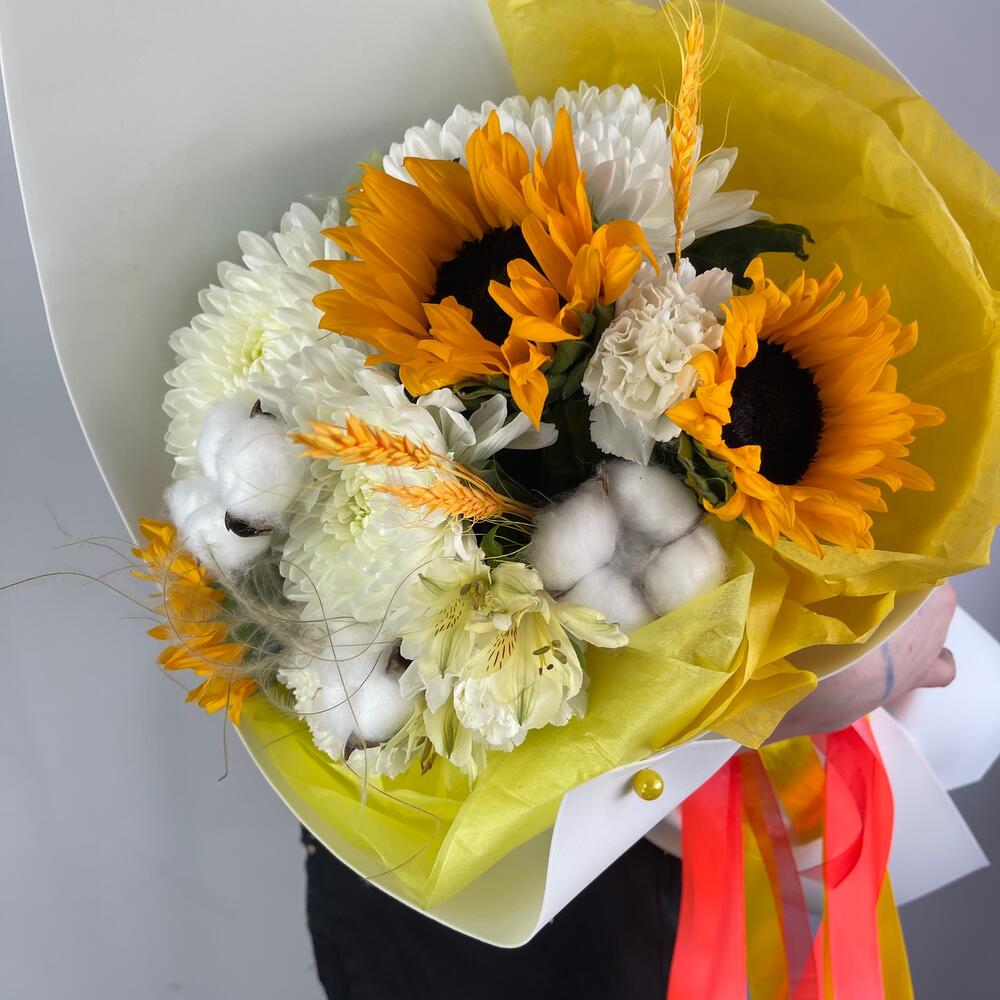 Альстромерия – 1 шт.Хлопок – 3 шт.Лента атласная – 2 шт.Диантус – 3 шт.Подсолнух – 3 шт.Упаковка дизайнерская – 2 шт.Стифа – 1 шт.Пшеница (сухоцвет) – 3 шт.антонов – 3 шт.