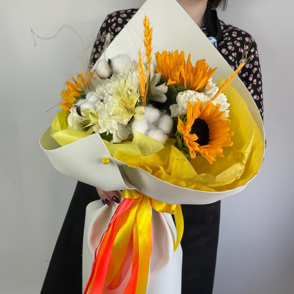 Категории: Альстромерии, Гвоздики, Подсолнухи, Сухоцвет
