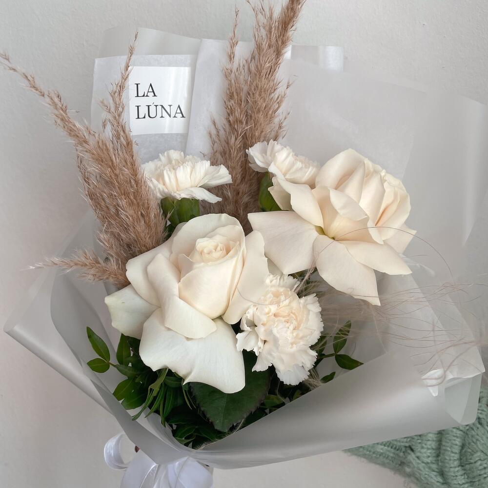 Лента атласная – 1 шт.Упаковка дизайнерская – 2 шт.Аквапак – 1 шт.Транспортировочная коробка – 1 шт.playa blanca – 2 шт.диантус белый сортовой – 3 шт.сухоцвет пучок – 3 шт.