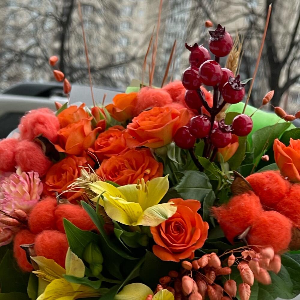 Кустовая роза оранжевая – 3 шт.Хлопок – 4 шт.Бриза – 5 шт.Пленка дизайнерская – 2 шт.Лента – 3 шт.Гвоздика сортовая – 1 шт.Альстромерия – 1 шт.Колоски пшеницы – 3 шт.Салал пучок – 1 шт.бриза оранжевый – 10 шт.Ягода декоративная – 1 шт.