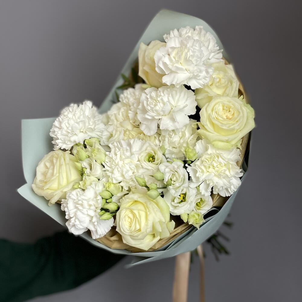 Белые розы и гвоздики , с веточками эустомы