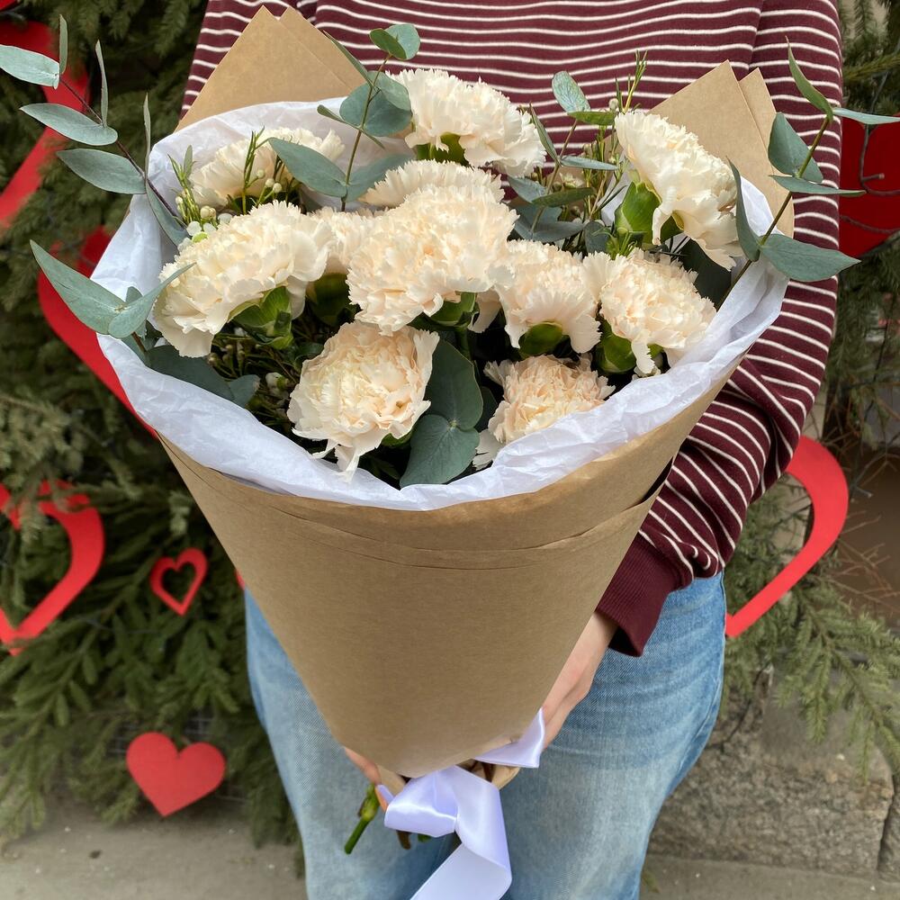 Диантус – 9 шт.Эвкалипт – 5 шт.Упаковка дизайнерская – 1 шт.
