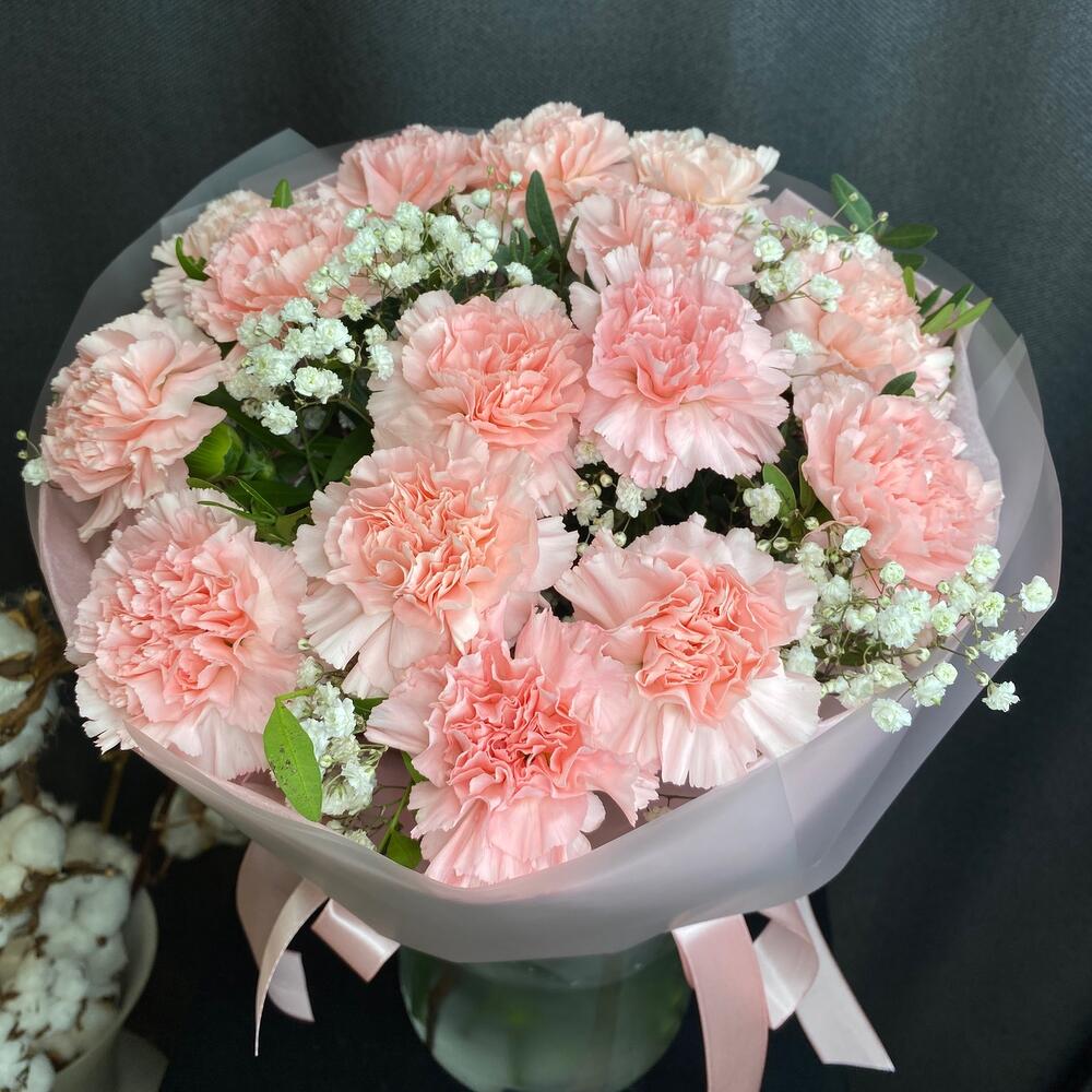 Гипсофила – 3 шт.Лента атласная – 1 шт.Диантус – 15 шт.Фисташка – 2 шт.Дизайнерская упаковка – 1 шт.