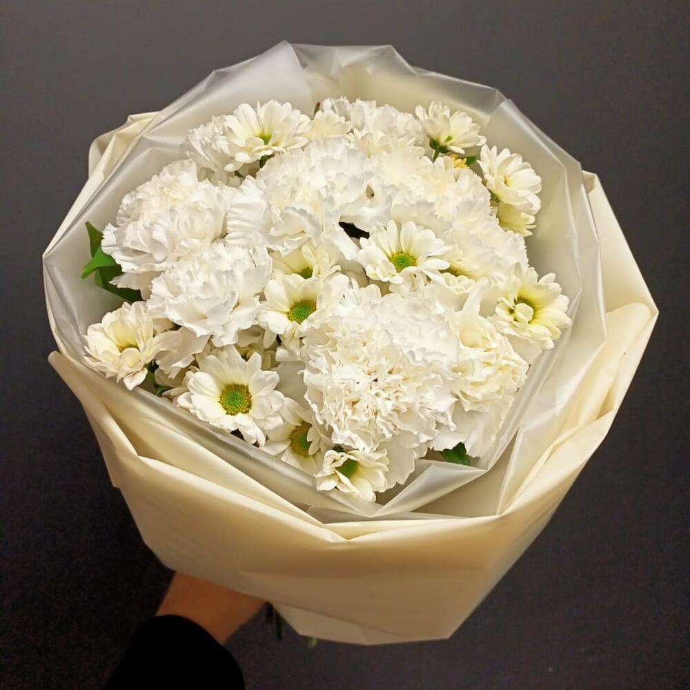 Диантус – 9 шт.Сантини – 6 шт.Упаковка дизайнерская – 1 шт.зелень декоративная – 3 шт.