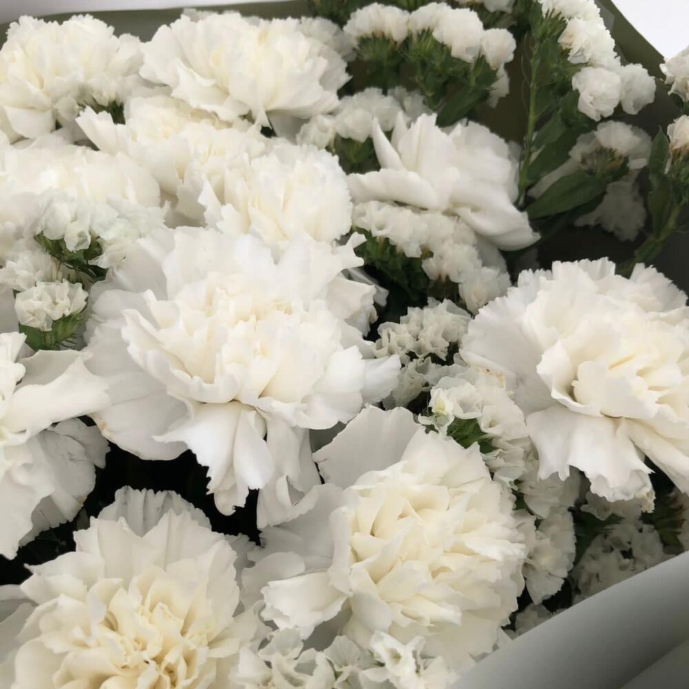 Статица белая – 5 шт.Диантус белый – 25 шт.Дизайнерская упаковка – 1 шт.индивидуальная надпись – 1 шт.ленты атласные – 3 шт.