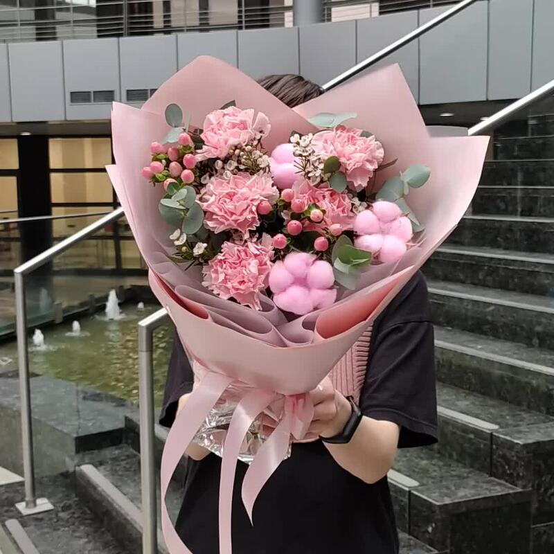 Гвоздика – 5 шт.Хлопок – 3 шт.Гиперикум – 2 шт.Ваксфлауэр – 1 шт.Эвкалипт – 1 шт.Упаковка дизайнерская – 2 шт.Лента – 2 шт.