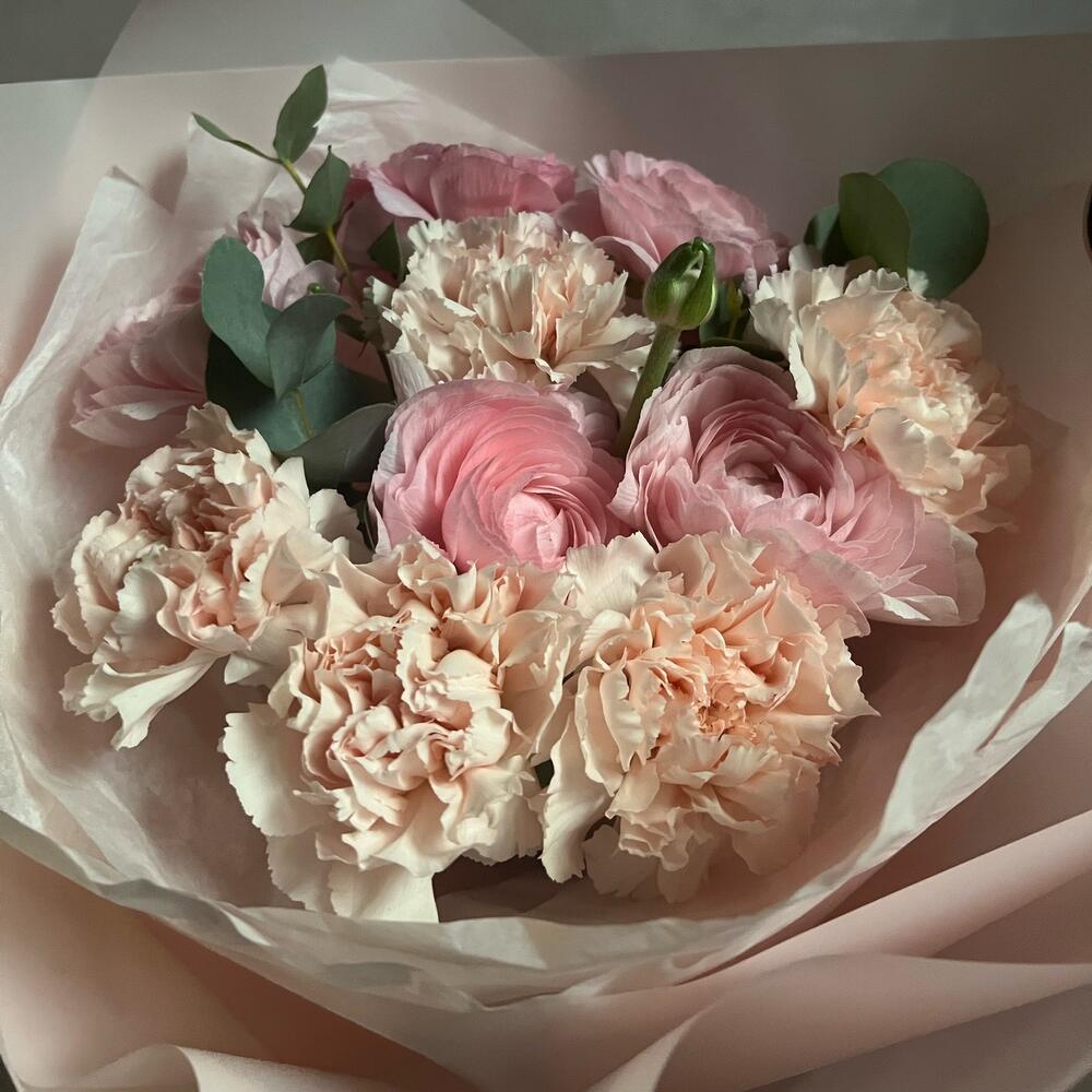 Ранункулюс – 5 шт.диантусы – 5 шт.Эвкалипт – 2 шт.декоративная упаковка – 1 шт.Атласная лента – 1 шт.
