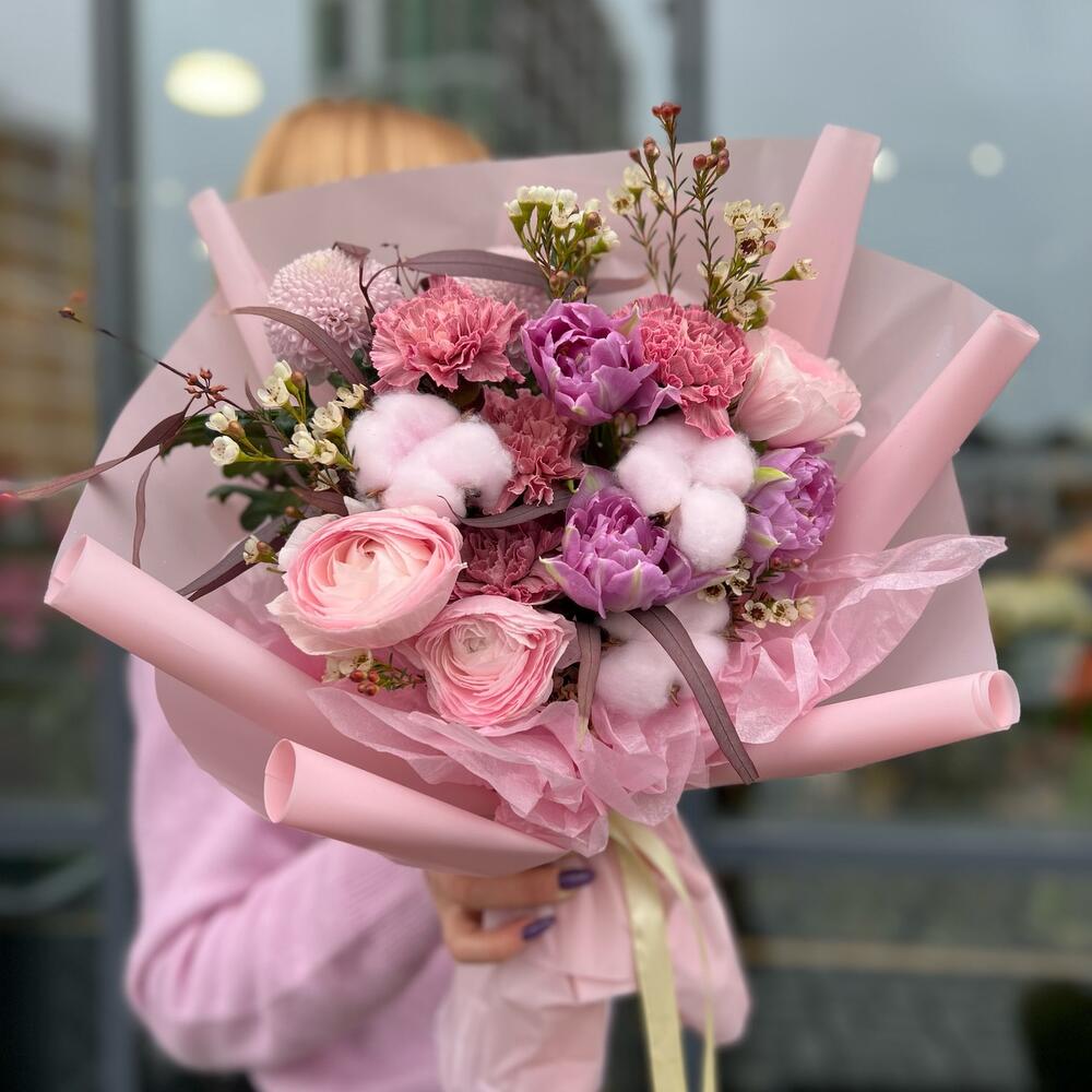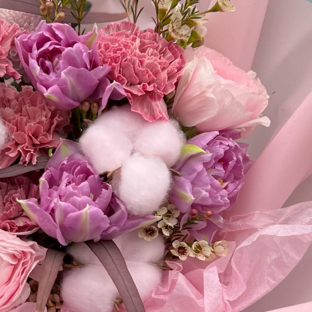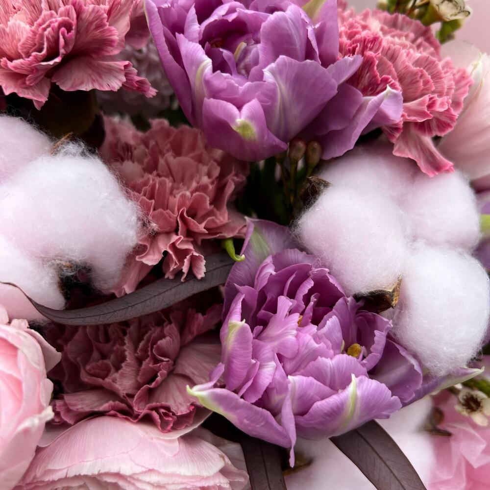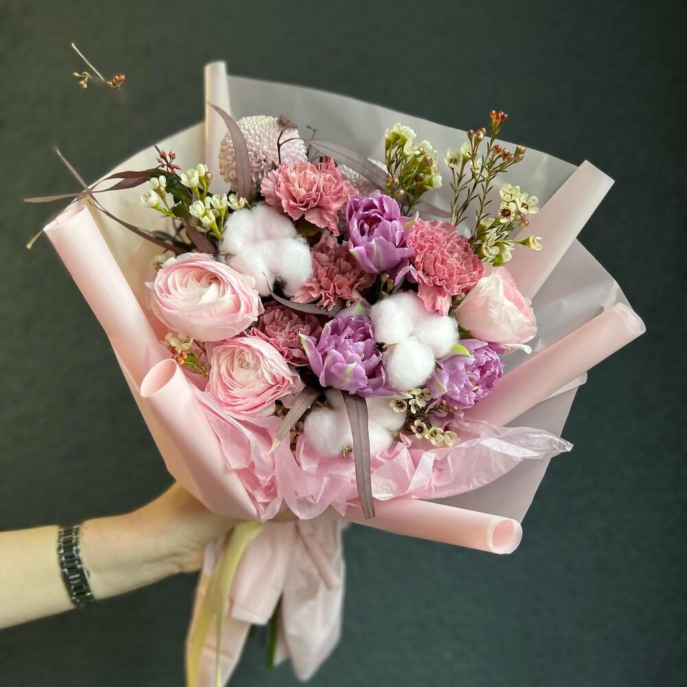 Тюльпан пионовидный – 3 шт.Ранункулюс – 3 шт.Диантус – 4 шт.Хлопок – 3 шт.хризантемы – 2 шт.Хамелациум – 1 шт.Эвкалипт – 1 шт.декоративная упаковка – 1 шт.Атласная лента – 1 шт.