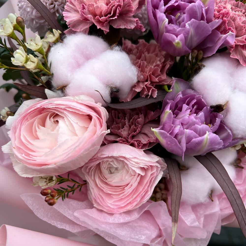 Букет из ранункулюсов, тюльпанов и диантусов «Лавандовая нежность»