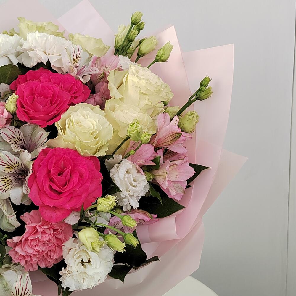 Альстромерия – 7 шт.Салал – 15 шт.Лента атласная – 10 шт.Роза кустовая пионовидная – 2 шт.Гвоздика сортовая – 7 шт.Упаковка дизайнерская – 8 шт.эустома белая – 5 шт.Роза одноголовая эквадор – 7 шт.
