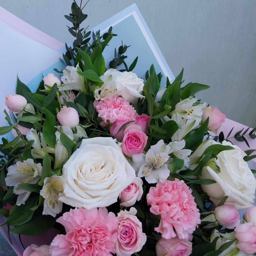 Альстромерия – 5 шт.Эвкалипт – 2 шт.Диантус – 3 шт.Роза кустовая розовая – 4 шт.Упаковка дизайнерская – 3 шт.фисташка зелень – 10 шт.роза пионовидная охара белая – 3 шт.
