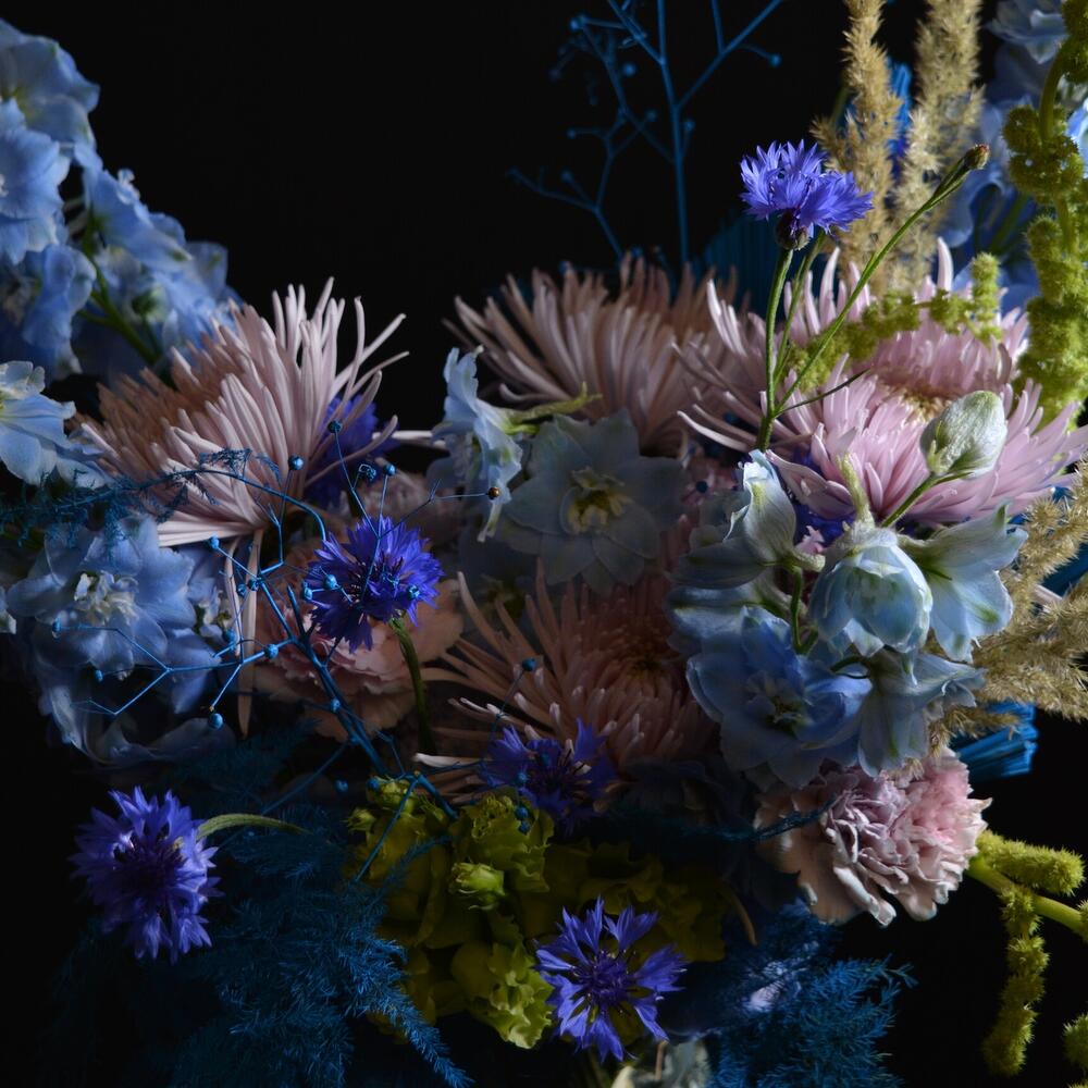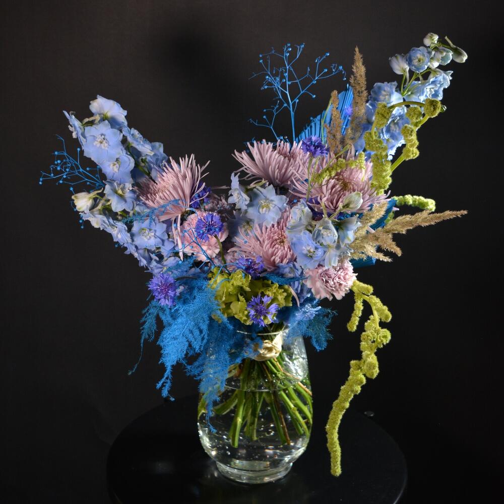 Хризантема – 5 шт.Гвоздика – 7 шт.Дельфиниум – 5 шт.василек – 7 шт.Злаки – 3 шт.Сухоцветы – 10 шт.Амарант – 3 шт.