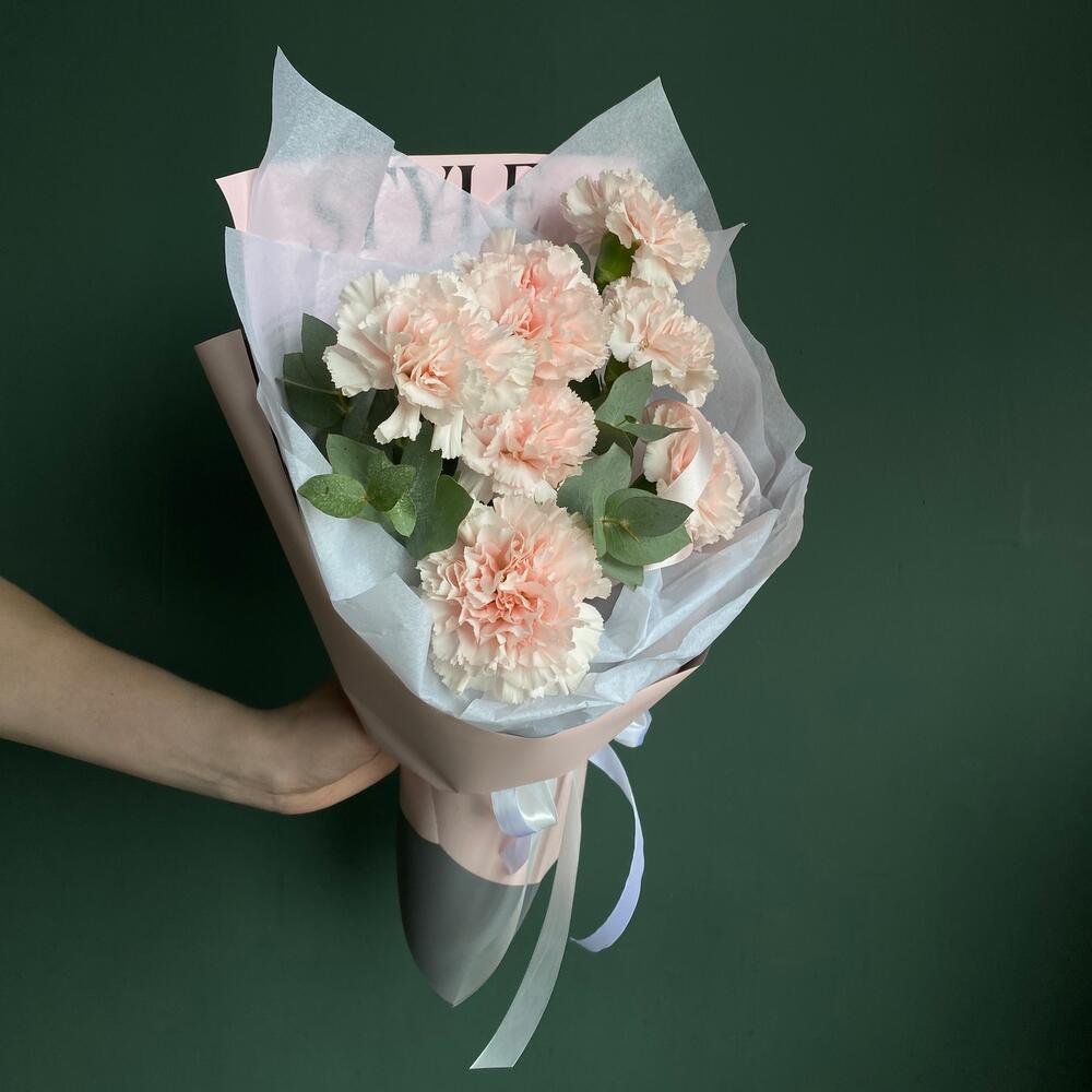 Эвкалипт – 1 шт.Упаковка дизайнерская – 1 шт.Открыточка с вашими пожеланиями – 1 шт.гвоздики – 7 шт.транспортировочная упаковка – 1 шт.уходовое средство для цветов – 1 шт.