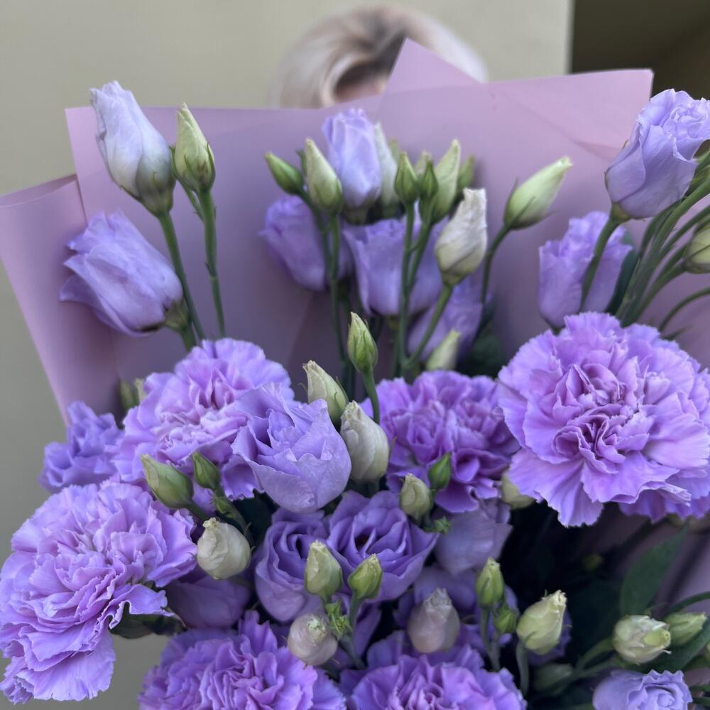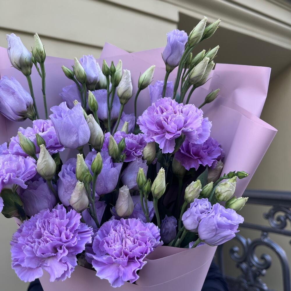 Лизиантус лавандовый – 5 шт.Диантус лунный – 7 шт.Упаковка корейская пленка – 1 шт.лента атласная лавандовая – 1 шт.