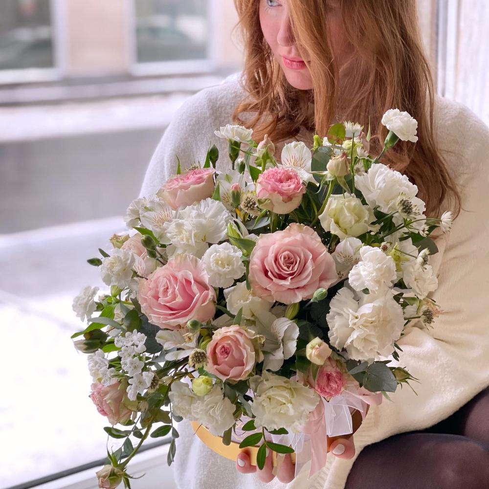 Роза – 3 шт.Роза кустовая – 2 шт.Лизиантус Алиса белый – 3 шт.Диантус сортовой – 4 шт.Альстромерия – 2 шт.Астранция – 2 шт.Эвкалипт – 2 шт.Фисташка – 2 шт.Коробка шляпная – 1 шт.Флористическая губка – 1 шт.Лента – 1 шт.