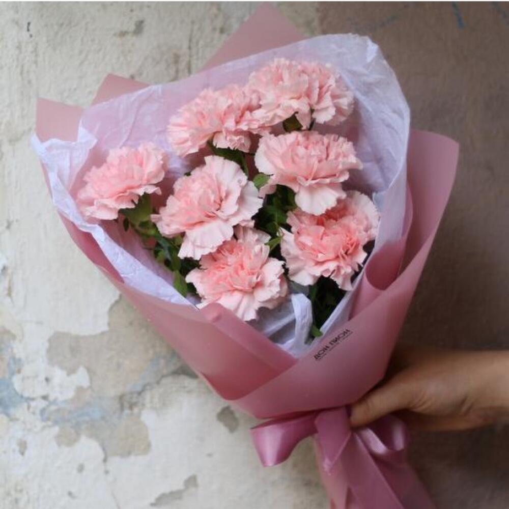 Диантус розовый – 7 шт.Эвкалипт – 1 шт.Упаковка – 1 шт.Лента атласная – 1 шт.