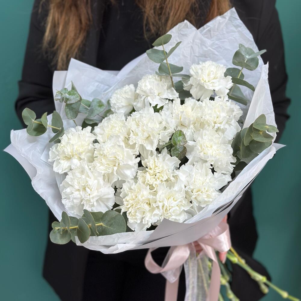 Лента – 1 шт.Эвкалипт – 1 шт.Современная упаковка – 2 шт.диантус сортовой (гвоздика) – 15 шт.