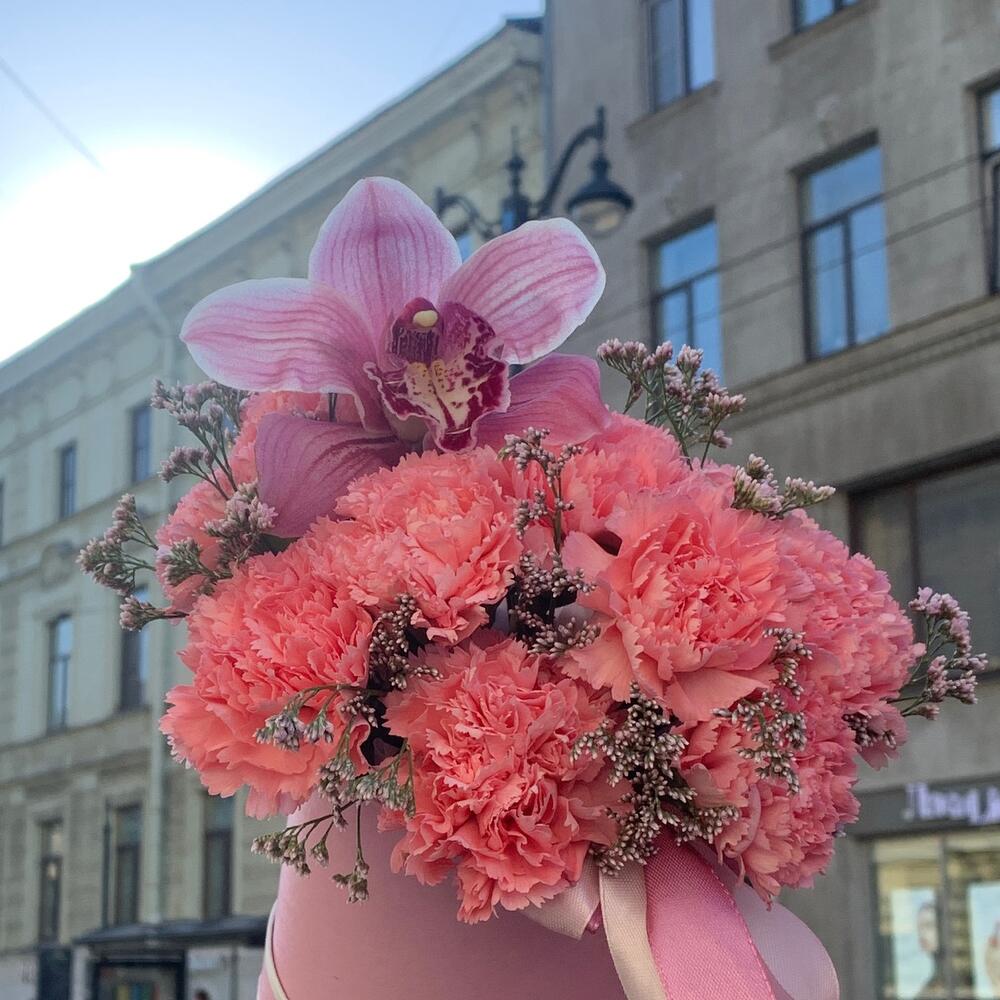 Лента – 2 шт.Лимониум – 2 шт.Орхидея Цимбидиум – 1 шт.Диантус – 11 шт.Пленка – 1 шт.Шляпная коробка – 1 шт.Губка флористическая – 1 шт.
