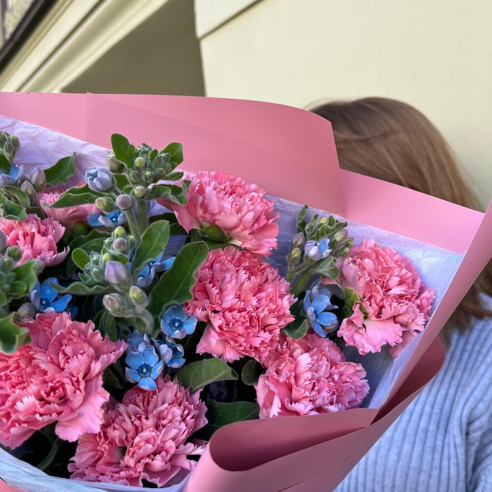 РОЗОВЫЕ ОБЛАКА – это букет, который подарит вам и вашим близким ощущение нежности и романтики. Диантусы и твидия – это цветы, которые имеют розовый и голубой и напоминают о сладких и мечтательных облаках. Этот букет – прекрасный подарок для тех, кто любит мягкие и изящные цветы.Чтобы букет радовал вас дольше, мы подарим вам специальное средство, которое надо будет добавить в вазу с холодной водой. Не забудьте подрезать цветы каждые 2 дня и менять воду – это тоже продлевает жизнь букету!
